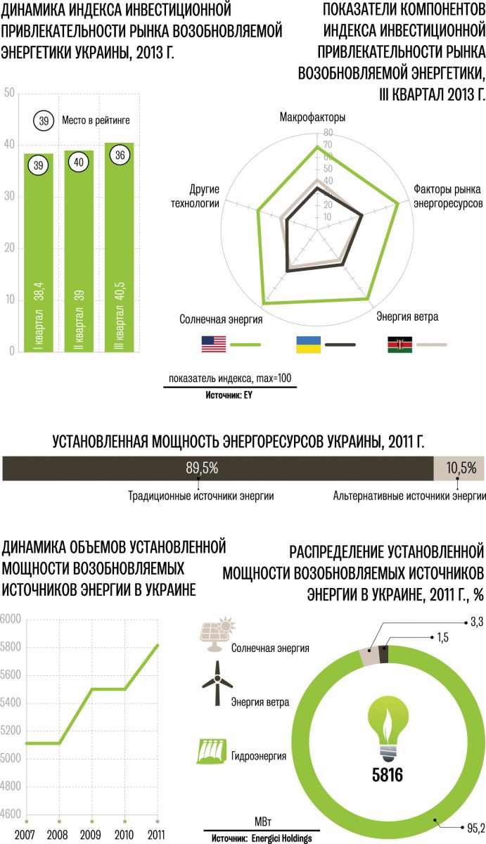 Но стоит также отметить, что, по данным канадской исследовательской компании Energici Holdings, развитие украинского рынка возобновляемых источников энергии постепенно набирает обороты: в период 2007‑2011 гг. ежегодный объем мощностей альтернативной энергетики, доля которой на 2011 г. составляла 10,5 % рынка, увеличился на 703 мегаватта, преодолев отметку в 5,8 тыс. мегаватт.
