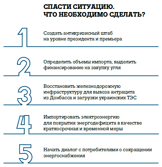 Этот антикризисный штаб должен работать 24 часа в сутки и иметь прямой контакт с первыми лицами государства. Такие примеры в украинской истории уже были в 1990‑х. Во-вторых, необходимо еще раз проанализировать, откуда страна будет импортировать уголь и как за него платить. В-третьих, необходимо срочно решать вопрос восстановления инфраструктуры для вывоза антрацита с Донбасса и загрузки отечественной генерации. В регионе заблокированно около 4 млн т угля — запас, позволяющий спокойно пройти зиму. Импорт электроэнергии для покрытия энергодефицита можно рассматривать только как временную и вынужденную меру.