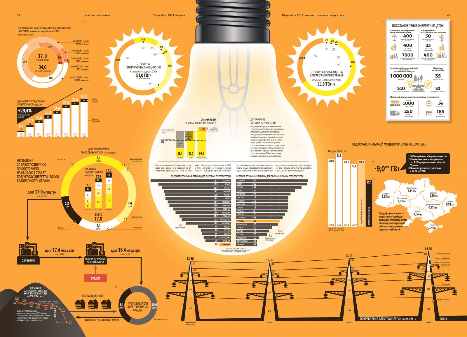 При финансовом дефиците ТЭС в 1,5‑2 млрд грн в месяц регулятор выделил отрасли дополнительно только 650 млн грн на квартал. При этом часть денег для закупки угля была изъята из программ реконструкции и модернизации генерации. В конце октября премьер-министр Арсений Яценюк даже пригрозил чиновникам обратиться в Генеральную прокуратуру, если страна останется без света.