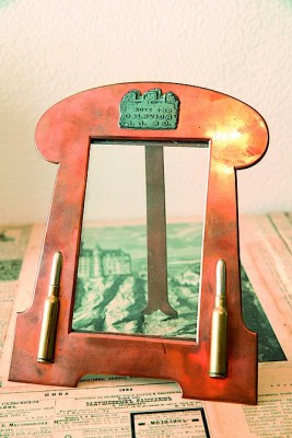 Или другой пример — шикарная рамка, приобретенная во Львове. Она сделана из меди, к уголкам припаяны два патрона (причем патроны до сих пор в идеальном состоянии), а к верхней планке — отличительный знак, который носили австрийские солдаты, воевавшие на итальянском фронте в Гориции — северной Италии, которая граничит со словацкими Альпами. На значке указан номер полка — 8. Раз уж его припаяли к рамке, можно предположить, что внутри была полковая фотография. Сегодня внутри этой рамки находится фотография танка Т-34 на фоне оживленной одесской трассы: это сочетание старого и нового мне показалось очень интересным.