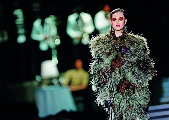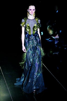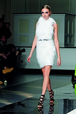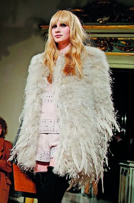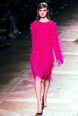 Лучший способ адаптировать перья к повседневности – игра на контрасте. Удачный пример сочетания несочетаемого можно встретить у Proenza Schouler: в коллекции этого бренда свитшот «женится» на юбке из перьев. Dries Van Noten тоже прибегает к нетрадиционным стилистическим комбинациям, дополняя перьевым декором строгое классическое пальто мужского кроя. Перья не утяжеляют вещь: они размещены на пальтовой ткани фрагментарно – небольшими пучками. Этот прием можно заметить в коллекциях Oscar de la Renta, Louis Vuitton и Emilio Pucci. Интересно выглядит окантовка из цветных перьев на строгом пальто-oversize в коллекции Christopher Kane. Еще один типичный для этого сезона прием – крупные массивы перьев на подоле, рукавах и баске. Вещи, воплотившие в себе эту тенденцию, можно увидеть у Chado Ralph Rucci, Monique Lhuillier или Julien Macdonald.