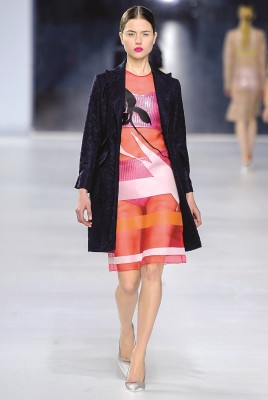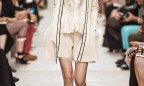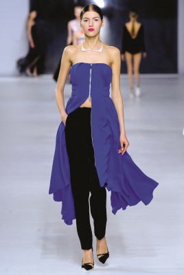 В этой коллекции снова не обошлось без фирменного «диоровского» new look, воплощенного в одежде светлых тонов и пастельных оттенков. Правда, неожиданных неоновых «вспышек» тоже хватает, особенно в виде контрастных ассиметричных вставок на платьях и топах. В качестве отделки Раф Симонс использует кружево и металлические змейки, причем в некоторых моделях сочетается и то, и другое. Кажется, будто на молниях лежит миссия передать спортивное настроение коллекции, а брючные костюмы насыщенных синих и красных оттенков лишь усиливают это предположение. В коллекции много прозрачных тканей, включая излюбленный материал дизайнера – органзу. Что касается фасонов, то Раф отдает предпочтение укороченным топам, юбкам-макси с завышенной талией, свободным брюкам из переливающихся тканей и ассиметричному крою - как в случае с платьями средней длины, так и с сарафанами «в пол».