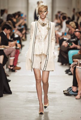 Карл Лагерфельд предлагает отправиться на каникулы в Сингапур, где он продемонстрировал круизную коллекцию Chanel 2014: в этом городе-государстве к услугам поклонников бренда целых шесть бутиков! Акценты в силуэтах новой коллекции расставлены следующим образом: завышенная талия юбок, брюки свободного кроя, пуловеры с V-образным вырезом и топы oversize. В круизной коллекции Chanel много жемчуга, вещей и аксессуаров молочного оттенка и цвета слоновой кости, но при этом ни одного яркого пятна. После нуарного настроения осенней коллекции Chanel светло-бежевая гамма кажется глотком свежего воздуха. Курортное настроение создают аксессуары и обувь: эспадрильи, соломенные шляпы, остроносые туфли-лодочки с характерным для Дома черным носком и интерпретации фирменной сумки Сhanel Boy в духе колониальной моды. Одним из источником вдохновения для этой resort-коллекции послужила игра в крикет: на подиуме Карл вручил моделям по бите и мячу для крикета и одел на них фирменные перчатки-митенки. Без излюбленного Габриэль Шанель монохрома опять не обошлось: есть и черно-белые купальники, и черные жакеты, представленные в паре с белыми брюками, а фирменная нежная камелия украшает удлиненный кардиган цвета южной ночи.