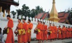 Буддистские монахи Луанг-Пхабанга — отдельная тема. Они составляют настолько обширную часть местного населения, что спустя пару часов прогулок по городу ярко-оранжевые рясы, как и их носители, перестают восприниматься как экзотика. Оранжевые прямоугольники сушатся после стирки на каждом втором балконе, монахи медитируют и читают книги в парках, прогуливаются по городу или зачарованно наблюдают за водами Меконга с высокого берега реки. По мере приближения к одному из здешних монастырей концентрация монахов увеличивается. Они охотно позируют туристам с фотоаппаратами, щедро раздаривая фотографам свои широкие улыбки, а в случае, если владеют английским, с удовольствием вступают в беседу. Хотя бы раз за время пребывания в Луанг-Пхабанге вам стоит встать на рассвете, чтобы увидеть нескончаемую вереницу монахов, которые идут по центральным улицам, принимая подаяние в виде горстей вареного риса от лавочников, владельцев кафе и прочих горожан, которые по этому случаю тоже пораньше вышли на улицы.