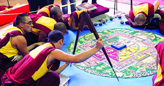 Ежегодно тувинские буддисты проводят удивительно красивый обряд, пришедший из Тибета, — строительство песочной мандалы. Из миллионов разноцветных песчинок монахи создают сложный орнамент буддистской космограммы. Этот кропотливый труд занимает несколько недель.