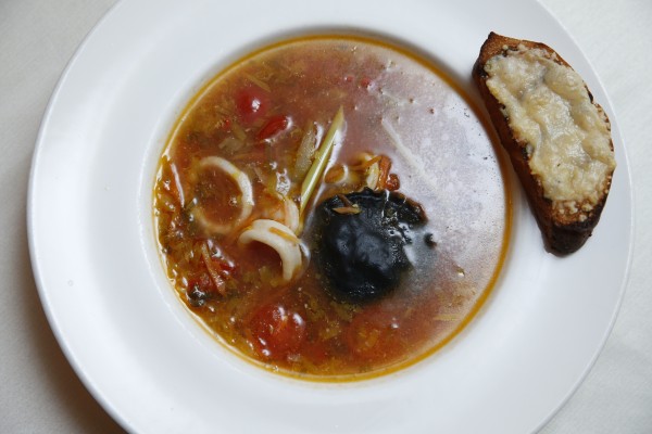 Всего в фестивальном меню семь позиций. Традиционно главный акцент сделан на итальянской кухне. Но «Сардинийский рыбный суп с креветками, кальмарами и лемонграссом» (300 г, 88 грн) должен понравиться и людям, влюбленным в Юго-Восточную Азию: остро-кислый, с чили, лаймом и лимонной травой, не выпячивающимися, благодаря тонкой нарезке жюльеном, морковью и сельдереем, сочными морепродуктами и большим черным равиолем с чернилами каракатицы, фаршированным измельченным филе дорады. Несмотря на яркий вкус супа, деликатная, казалось бы, рыба в нем не теряется, а наоборот — вносит необходимую сладковатую ноту. Равиоль сам выглядит в тарелке, как рыба в океане, притаившаяся среди овощных «водорослей», за «камушками» — половинками помидоров черри.