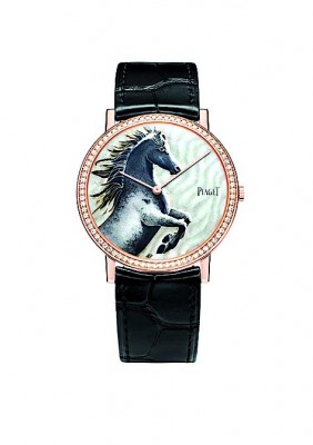 Для изготовления циферблатов часов серии Chinese Zodiac Horse мануфактура Piaget прибегла к помощи независимого эмальера Аниты Порше, которая занималась созданием циферблатов для Ulysse Nardin, Vacheron Constantin и Jaquet Droz. И раз уж часы посвящены китайскому Новому году, то и использовать в процессе работы Анита решила популярную в Китае технику перегородчатой эмали. С помощью золотой проволоки она создала перегородки на циферблате, потом заполнила получившуюся форму эмалью, обожгла и отполировала. На циферблате этой модели изображена лошадь ферганской породы.