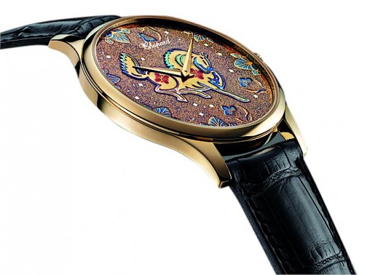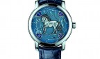 Под циферблатом с изображением лошади находится вращающийся перламутровый диск с часовой, четвертьчасовой и пятиминутной разметкой. Время, в окошке у отметки «8 часов», обладателю этой модели придется определять с помощью всего одной стрелки. На задней панели, сделанной из сапфирового стекла, нарисованы 11 животных из китайского календаря, а роль лошади выполняет бриллиант. Рисунки животных выполнены в технике Verre Eglomise: изображение сделано на золотой фольге, нанесенной на внутреннюю сторону стекла.