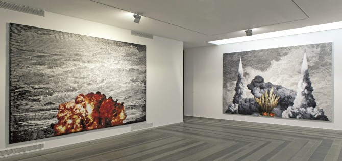 Харьковчанин Артем Волокитин всегда апеллировал к самым личным переживаниям, исследуя телесность и пространство в своих грандиозных гиперреалистических живописных работах. На выставке в РАС он впервые обращается к теме социальных потрясений, показывая три полотна, посвященные насилию и разрушению, двигаясь от ужасающей красоты взрывов («Необратимая красота», 2014) к обезличенному пространству линейной черной абстракции, которая не оставляет места жизни и человеку. Горе, лишения, безнадежность остро звучат в видео «Сестры» (2006‑2014), где четыре сестры оплакивают смерть матери, превращаясь в обобщенные образы плакальщиц, теряя связь с конкретной, частной ситуацией. Это растворение личного горя и утраты в безличной неотвратимости, которую несет война, — пафос экспозиции Волокитина.