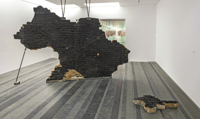 Центральная часть экспозиции Жанны Кадыровой — вырезанная из сгоревшей стены бывшей советской фабрики в Шаргороде карта Украины с отколовшимся фрагментом в форме Крыма, одна сторона которой — обугленные кирпичи, а другая заклеена старыми советскими обоями. Пастельные цвета и незамысловатые, наивные узоры резко контрастируют с неровными краями карты и особенно ее черной изнанкой, свидетельствуя о внезапности политических конфликтов, ломающих привычный уклад жизни обывателя.