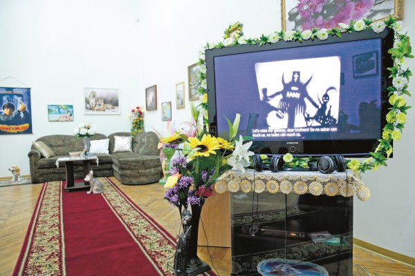 Работа Стаса Волязловского почти не претерпела изменений, а просто была адаптирована к музейному пространству. Херсонский художник прославился прежде всего своим долгосрочным проектом «Шансон-арт», основу которого составляли простыни с рисунками шариковой ручкой — что‑то среднее между криминальными татуировками и китчевыми рисунками. В это общее направление органично вписывается и представленный на выставке «Украинский уют» — набор банальных «красивых» предметов постсоветского интерьера (постеры, ковры со львами, статуэтки котиков и собачек, подсвечники с ангелочками и другое), обильно украшенных искусственными цветами, создающие в целом диковатое ощущение пестрой безвкусицы. Но это — только иронический антураж для видеоработ художника, демонстрирующихся на экранах телевизоров.