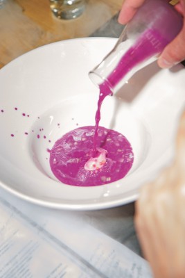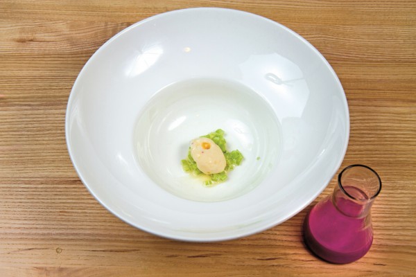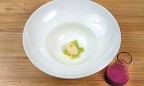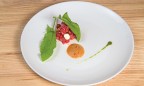 В тартаре из телятины, красной смородины, щавеля и пены из бородинского хлеба, на мой взгляд, немного не хватило баланса вкуса. В красной смородине, пока, увы, нет той спелой сладковатости, которую надеешься ощутить. В результате — перегиб в сторону кислоты, который можно было исправить пеной из сладковатого, пряного бородинского хлеба и легкого солоноватого домашнего майонеза, будь их чуть больше. Но к свежести и качеству продуктов вопросов, безусловно, нет. Холодный суп из краснокочанной капусты с горчичным мороженым произвел фурор среди собравшихся и, пожалуй, стал безоговорочным хитом сета. Капуста — овощ с огромным неиспользованным потенциалом, чьи вкусовые и текстурные качества недооцениваются многими поварами, возможно, «травмированными» в детстве овощными супами и тушеной капустой дома и в детском саду. К счастью, Юрий Приемский к числу «пострадавших» не относится — он выдавил свежий сок из краснокочанной капусты, смешал его с хлебными крошками, благодаря чему ушла специфическая горчинка. После вторичного отжима жидкость не только обогатилась дополнительным вкусом, который был к тому же сбалансирован винным майонезом и уксусом, но и приобрела консистенцию супа. Для любителей окрошки и гаспачо в суп добавили нарезанный мелкими кубиками свежий очищенный огурец, привнесший свою свежую нотку. А горчичное мороженое довело блюдо до идеального состояния. Дополнительный бонус — подача: зрители (точнее, гости ресторана) как завороженные наблюдают за разлитием из дымящихся сосудов красивой жидкости по порционным тарелкам. Вау-фактор в действии.
