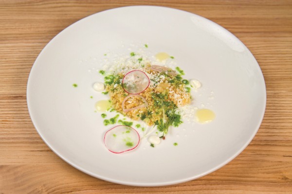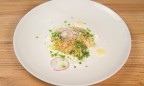 Первое блюдо сета, кускус с щучьей икрой и соусом из огурца, укропа и сметаны — самое нежное, переносящее в детство, к сорванным на бабушкиной грядке первым зелени и овощам, смешанным с домашней сметаной. Игра текстур практически равноразмерных пшеничного, мягкого кускуса и щучьих икринок, лопающихся на зубах и служащих естественным источником соли, насколько я знаю, впервые используется в меню киевских ресторанов.