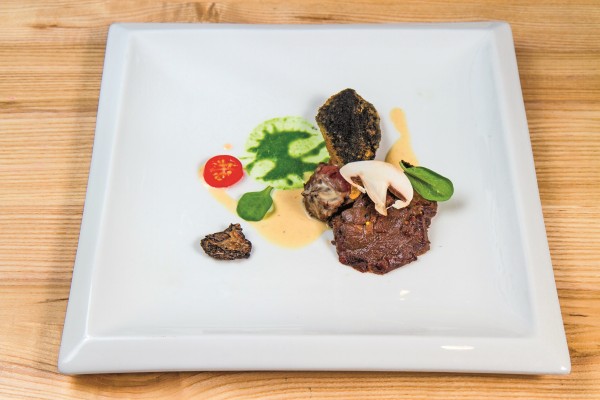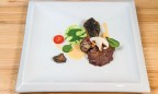 Телячий ростбиф с баклажанами и соусом из сморчков на вид и на вкус — самое понятное и привычное блюдо. Мясо томится при низкой температуре, после чего быстро обжигается на огне, оставаясь сочным и нежным. Баклажан — также сочный и маслянистый, «хоть на хлеб намазывай». А зола из него привносит необходимую соленую нотку. Первые весеннее-летние грибы — сморчки, те самые знаменитые во всем мире мореллы, добавляют блюду «шашлычно-природный» характер.