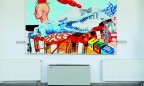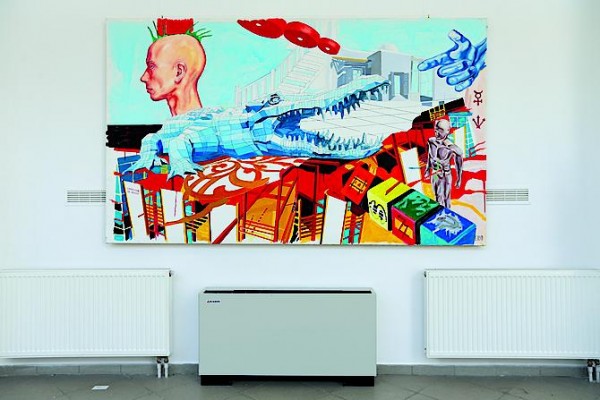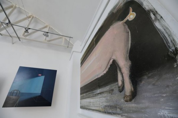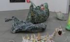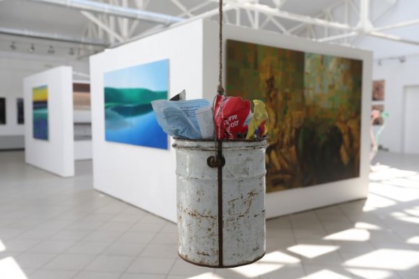 Горизонты здесь разные. Вслед за живописной метафизикой Белика идут фотоэксперименты с маринистическими и урбанистическими пейзажами Олега Димова и Дмитрия Евсеева. Вот тяготеющие к абстракции полотна уже достаточно широко известной в столице Альбины Ялозы. Две ее работы из серии «Потерянный рай» (2012) — берег моря, закрытый угрожающей черной сеткой, — теперь кажутся предчувствием происходящих в Украине событий. Вот работы Антона Логова: абстрактное полотно — отсылка к авангарду начала XX века; огромный коллаж — разработки будущей «чистой» супрематической живописи; инсталляция — подвешенное мусорное ведро, в котором скомканы остатки журналов (возможно, из них и был собран коллаж). Создается впечатление, что Логов, дополняя живопись материальными элементами, нащупывает не только границы холста, но и возможность присутствия себя самого в произведении.