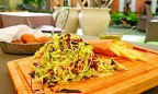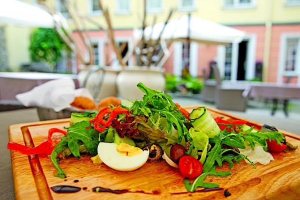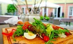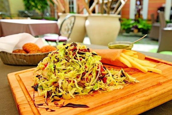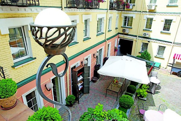 Цены в «Дворике» примерно в два раза ниже «воздвиженских». В среднем от 100 до 200 грн. Все меню «Дворика» создано стараниями шефа Дмитрия Руденко. Летом аппетит может удовлетворить Салат-брускетта с молодым сыром и помидорами (чиабатта, молодой фермерский сыр, помидоры, салат «Айсберг», маслины, оливки, базиликовый соус — 350 / 70 / 30 г, 139 грн) или Салат-брускетта с лососем и дижонской горчицей (чиабатта, лосось шеф-посола, горчица дижонская, огурец, салат «Айсберг», маслины, оливки, базиликовый соус —350 / 70 / 30 г, 139 грн). Оба салата (огромные порции) выкладываются на неразмокающие подсушенные ломтики домашнего хлеба, а овощи и зелень ежедневно завозят в отель. В одном случае сытности добавляют ломтики тонко нарезанного сыра типа сулугуни, во втором — гравлакс собственного «секретного» посола. Хотя и молодой, но умелый шеф готов к общению, если выдается свободная минутка.