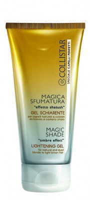 Марка Collistar представила домашнее средство для осветления волос по технике Ombre. Модное окрашивание с размытой по горизонтальной линии границей возможно с гелем Magic Shade — для этого гель наносится на кончики волос. Для мелирования его используют на отдельных прядях. В результате волосы выглядят так, будто выгорели на солнце. Средство наносят на чистые сухие волосы и оставляют высыхать. Результат проявляется постепенно, поэтому интенсивность окрашивания можно контролировать — повторять процедуру раз в два дня до получения желаемого оттенка. Magic Shade предназначен для светлых натуральных и окрашенных волос и не рекомендуется для оттенков темнее светло-коричневого. Дополнительный плюс — ухаживающие компоненты в составе.