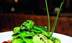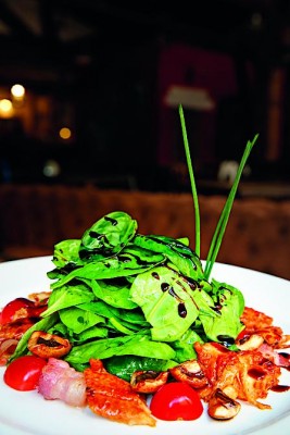 Та же «проблема» с салатом из шпината с копченым угрем (200 г, 99 грн). Интересное блюдо за счет «несочетаемых» продуктов: рыбы, грибов, бекона дополнено щедрой порцией листьев свежего шпината и соусом унаги. Но дополнительная заправка из горчицы, белого бальзамического уксуса, сока лимона и оливкового масла требует запить это блюдо если не пивом, то водой или вкуснейшим местным белым квасом.