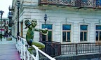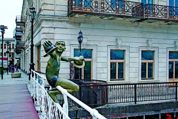 После традиционно обильного грузинского обеда прогуляйтесь по пешеходному Белому мосту, получившему название благодаря своим белоснежным перилам. На этих перилах восседает бронзовая фигура мальчишки с двумя шляпами в руках. Этот памятник запечатлел сцену из фильма «Необыкновенная выставка», снятого в 1968 году. По сюжету фильма малолетний хулиган сорвал шляпы с голов двух мирно беседовавших мужчин и, используя их как парашюты, сиганул с моста. Вообще нестандартных памятников в Кутаиси хватает.