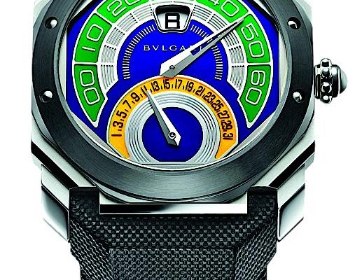 В честь проходящего в Бразилии чемпионата мира по футболу итальянская мануфактура Bulgari выпустила часы Octo Bi-Retro Brazil с необычной системой индикации времени. Часовой стрелки в этой модели нет, зато есть функция прыгающего часа. Индикация часов производится с помощью апертуры на отметке «12». Несмотря на то, что первые часы с такой функцией появились 300 лет назад, обычно апертуры используются для индикации даты. Итак, когда ретроградная минутная стрелка, движущаяся вдоль 210‑градусной шкалы, доходит до отметки «60», цифра в окошке меняется. Ну а функция отображения даты в Octo Bi-Retro Brazil осуществляется посредством ретроградного индикатора, движущегося вдоль 180‑градусной дуги в нижней части циферблата. Ретроградный индикатор — это стрелка, описывающая не полный круг, а только его часть, и скачком возвращающаяся к началу отсчета, дойдя до конца шкалы. Поскольку ретроградных индикаторов в этой модели два, часовщики Bulgari окрестили часы Bi-Retro.