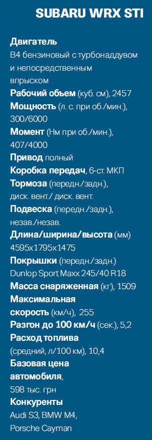 Нынешнее поколение STI на первый взгляд толерантно по отношению к пользователю — чтобы развернуть седан поперек дороги, нужно совершить что‑то воистину глупое. Но адепты явно поспешили с посыпанием голов пеплом сожженных керамических сцеплений и тормозных дисков. Как бы STI не «уменьшал градус», седан все равно провоцирует на атакующую езду. Достаточно сказать, что за всю неделю нашего тест-драйва расход топлива не падал меньше 16 л / 100 км. С другой машиной в голову давно бы пришла логичная мысль о пробитом бензобаке, но не в этом случае. Здесь лючок — самая частооткрываемая дверь в седане. Вообще субаруводов качество бензина беспокоит куда больше качества питьевой воды и они знают обо всех АЗС в радиусе 100 км от дома. Как и о аэродромах, хотя не имееют ничего общего с авиацией и уверены, что доехать до Одессы быстрее, чем долететь, хотя и дороже.