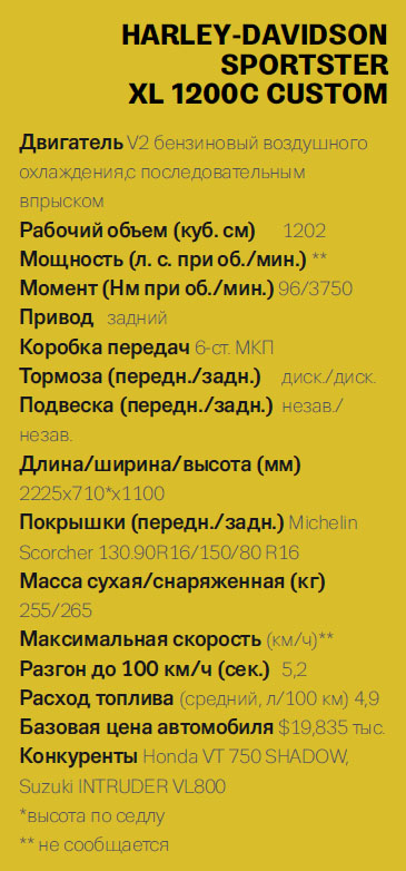 Исходя из антропометрических, функциональных и эстетических предпочтений, мой выбор пал на XL 1200C — самый массивный и индивидуальный кастом в линейке Sportster. Ровные, как гитарная струна, сварочные швы на маятнике вилки без слов сообщали о том, что лежачие полицейские — не сбавлять ход. С другой стороны, 1,5‑метровая база и зажатые подвески обеспечивают отменную курсовую устойчивость. Плотная посадка с глубоким и низким сиденьем, сдвинутые назад и чуть приподнятые рулевые рычаги — все как в старые добрые времена. Именно на таких 1000‑километровых дальнобоях, катя по не очень ровным дорогам родины, осознаешь — эта, казалось бы, устаревшая эргономика является единственно приемлемой для столь жесткого шасси и растянутой геометрии. Но, правда, ехать быстрее крейсерских 120‑130 км / ч уже не в радость. Sportster и прежде был моделью в прямом смысле слова не для слабаков, а теперь и подавно — чтобы совладать с новым 1,2‑литровым мотором серии Evolution, сил понадобится еще больше. Особенно это касается мышц спины, так что вертикальная посадка — не самый подходящий вариант для высоких скоростей. Впрочем, долго гнать в полную силу у вас вряд ли получится, ведь на «спортстерах» по определению отсутствуют ветровые стекла.