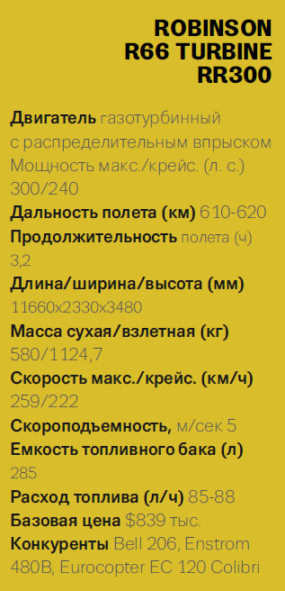 Двигатель новейшей модели R66 специально разработан компанией Rolls-Royce, в качестве топлива используется керосин ТС-1, который очень распространен в наших краях и в три раза дешевле авиабензина. 66‑й — самый доступный из газотурбинных вертолетов. Поэтому в специализированной прессе для продукции Robinson Helicopter не жалеют эпитетов и оборотов вроде «непревзойденный шедевр конструкторского искусства». И все это заслуженно — при в 3‑4 раза меньшей цене он по летным характеристикам мало в чем уступает тяжелым газотурбинным вертолетам.