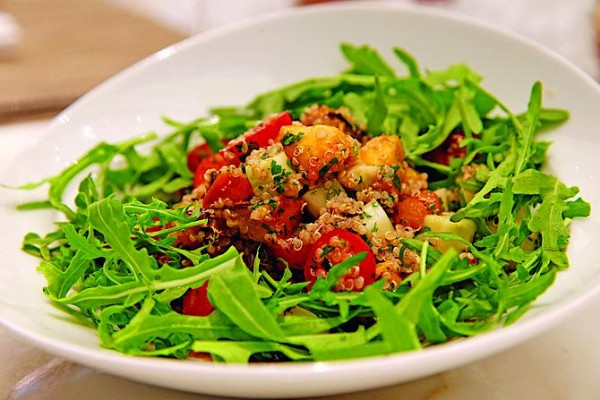Основные блюда представлены лососем-гриль с обожженными на гриле кусочками персика, зеленой спаржей и сальсой из авокадо (300 г, 220 грн) и утиной грудкой с глазированными персиками, чечевицей и тыквой (300 г, 240 грн). Я бы выбрала утку, но «для работы» интересно попробовать рыбу. Шеф советует взять к лососю Салат с киноа, персиками, огурцом, мятой и лаймом (200 г, 85 грн), так как лосось — яркое блюдо с насыщенными вкусами, как и салат с козьим сыром. Негоже, чтобы салат перебивал вкус основного блюда. Салат — легкий, но питательный и уже стал одним из самых популярных блюд меню. Сладость персика гасят легкая кислинка помидора, свежесть огурца и мяты, заправка с лаймовым соком и цедрой.