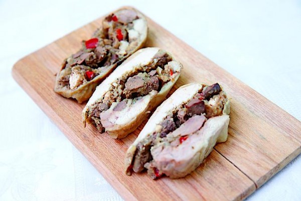 Куриный галантин — куриное филе, начиненное куриной же печенью и запеченное. Чуть суховатое, диетическое, с овощами — очень вкусно.