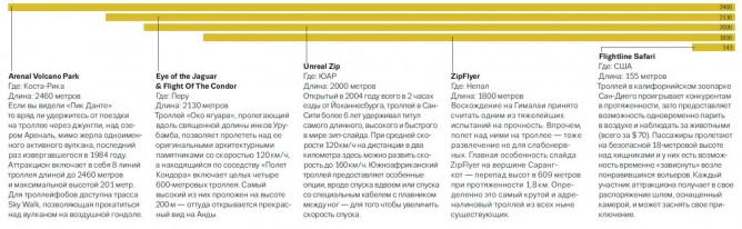 Zip-Line, rope slide, flying fox — все это названия одного приспособления — троллея — экстремального аттракциона, в последнее десятилетие ставшего невероятно популярным во всем мире. От привычной канатной дороги экшен-троллей отличается отсутствием каких‑либо кабинок и прочих сложных механизмов — здесь спуск осуществляется под давлением собственного веса человека (или, как нас учили на уроках физики — под действием силы тяжести).