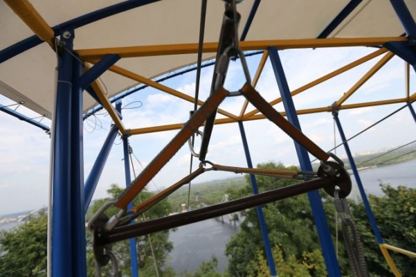 Ничего принципиально сложного в устройстве троллея нет: человек спускается на подвижном ролике, скользящем по тросу, натянутому под определенным углом из пункта А в пункт Б. В столичном троллее первым пунктом является Арка дружбы народов, вторым — Труханов остров, расстояние между которыми 532 метра.
