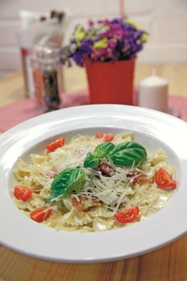 Вид пасты ежедневно меняется: в «мой» день были «перышки» — пенне. На следующий будут, допустим, фузилли, фарфалле или баветте. Соусы универсальны и не зависят от вида макаронных изделий, с которыми их подают.