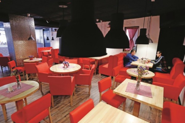 В целом впечатления очень приятные. Интерьер выдержан в красно-белых цветах, но не кричащий, а уютный, с удобными мягкими диванами и стульями. Необходимость регулярно выходить из‑за столика то за салфетками, то за паролем Wi-Fi не раздражает, скорее позволяет почувствовать себя, как в гостях у друзей.