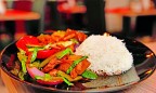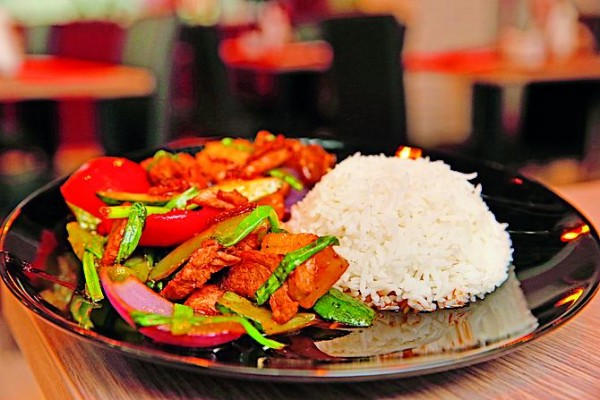Последнее — самое красивое и большое блюдо — свинина в кисло-сладком соусе с овощами и рисом. Правильно его было бы назвать «сладкие свинина и овощи с пресным рисом». Рис — абсолютно безвкусный, а свинина и овощи (красный лук «Марс», который здесь называют крымским, огурцы, сладкий перец, зеленый лук) — просто очень сладкие, без намека на соленость или кислинку, не говоря о других вкусовых оттенках. Еще один нюанс: если бы на столе стоял хотя бы соевый соус, обязательный для азиатских заведений, было бы проще съесть хотя бы на пару кусочков больше, чтобы просто утолить голод. Из приправ на столе — только соль и черный молотый перец.