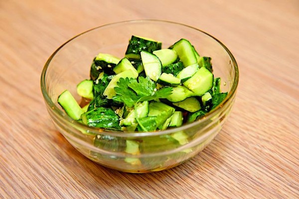 Нарежьте огурцы поперек кусочками размером 4‑5 см. С силой отбейте их (1‑2 раза) плоской стороной тесака или широкого кухонного ножа, чтобы огурцы развалились на более мелкие кусочки (чтобы не разлетелись по всей кухне, можно сложить их в кулечек). Переложите в миску и посыпьте мелко нарезанным чесноком, приправьте маслом, солью и уксусом. Мариновать перед подачей от 15 минут до нескольких часов.