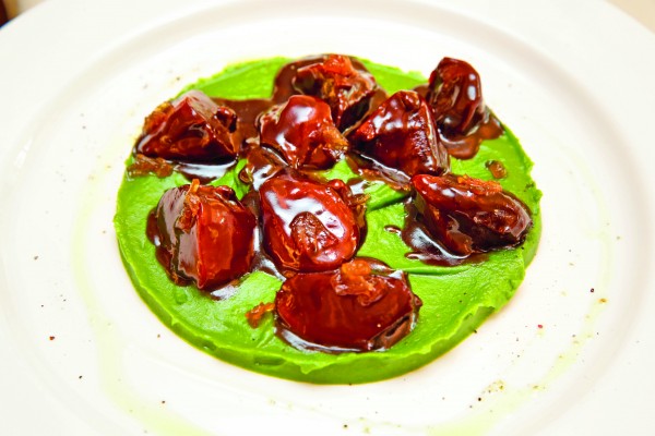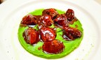 К радости тех, кто успел влюбиться в предыдущее меню, в новое перевели самые востребованные позиции. В частности, боккончини из утиных желудочков с пюре из картофеля и петрушки (280 г, 139 грн). Когда я его увидела, в сознании тут же зазвучали «эльфийские» композиции Enya, а воображение нарисовало опушку в вековом лесу, где сквозь кружевную вуаль зеленых листьев и ветвей на мшистых валунах, вросших в землю со времен ледникового периода, и густом ковре из травы и цветов резвятся солнечные блики. Вкус блюда в полной мере отображает визуальный образ. На тонкой «подушке» картофельного пюре насыщенного зеленого цвета, подаренного ему соком петрушки, как камни на друидском святилище, лежат кусочки плотных «мышечных» желудочков, томимых до мягкости. Их насыщенный вкус подчеркивают густой соус на основе демигласа и капельки лукового мармелада, медленно стекающие в пюре и пропитывающие его — уверенные в своей доминантности.