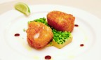 Наггетсы из клыкача с пюре из цукини (230 г, 259 грн), наверное, мой фаворит. На «брусочке» воздушного пюре, покрытого ярко-зелеными кубиками бланшированных овощей, лежат два больших наггетса — толстые кусочки нежного сочного рыбного филе, обжаренного в японских панировочных сухарях. Капельки бурого соуса здесь не только для украшения. Соединенный с деликатным пюре соус производит настоящий вкусовой взрыв. Без разрушений, если не считать стереотипа о том, что кабачки — простой продукт, пригодный лишь для оладий да поджарить с чесноком. Если вы любите яркие ощущения и вкус рыбы вам покажется слишком сдержанным, выдавите на нее сок из клинышка лайма, которым здесь снабжают каждое морское блюдо.
