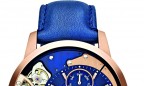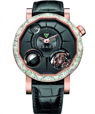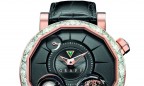 Diamond Gyrograff Tourbillon в 48‑миллиметровом корпусе из розового и белого золота — очень сложное устройство, и даже использованные для отделки корпуса 72 бриллианта не могут надолго отвлечь внимание от двухосного турбийона и гироскопического индикатора лунных фаз. За работой этих усложнений можно наблюдать бесконечно, а чтобы вы не забыли вовремя подзавести механизм, на циферблате предусмотрен индикатор запаса хода. Тираж — 20 экземпляров, цена пока не объявлена.