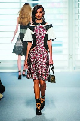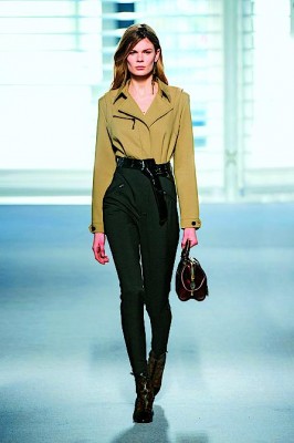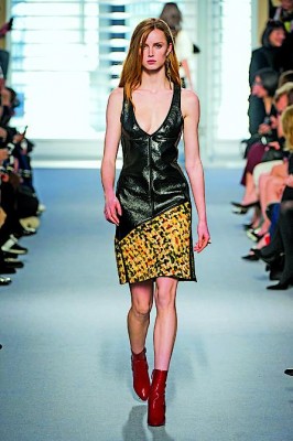 Для любительниц total look в коллекцию включен двухцветный комбинезон с широкими, словно позаимствованными из мира мужской моды лацканами, и брюками-сигарами с завышенной талией. Минималистичные женственные платья из кожи с ассиметричными вставками из твида льстят любому типу фигуры благодаря А-силуэту. Также хороши сатиновые струящиеся наряды — нежные, с навеянными Индией цветочными орнаментами, с черными кожаными и вельветами вставками на плечах и талии. Сочетание разных фактур — любимый прием Жескьера в этой коллекции.