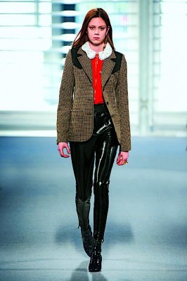 Например, вставки из неопрена или винила или трехмерная вышивка. Приталенный шерстяной boyfriend-жакет с рисунком «куриная лапка» дизайнер лишил академичности, украсив его контрастными по цвету вставками из молескина. Его он предлагает надевать поверх ярко-красного жилета из джерси с белоснежным воротничком «Питер Пен».
