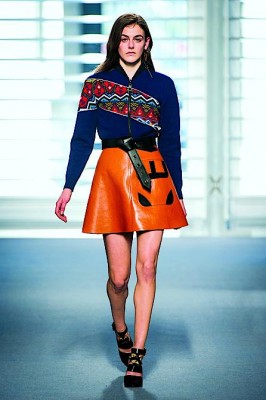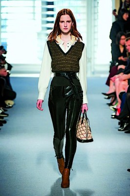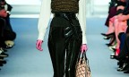 В сочетании с брюками-сигаретами из винила весь ретро-налет образа вообще улетучивается. Хороши белые водолазки из полиамида с воротником-резинкой, которыми в Louis Vuitton вполне резонно гордятся. Материал для них производят на японских фабриках: в его структуру входит хлопковый слой, пропускающий влагу и позволяющий коже дышать. Николя Жескьеру эта ткань понадобилась для того, чтобы добиться идеальной белизны — в отличие от хлопка, который имеет природные кремовые оттенки, водолазки из полиамида даже через несколько лет не теряют своей изначальной белизны. Сочетать их дизайнер рекомендует с узкими, словно леггинсы, брюками из глянцевого винила и А-образными юбками из принтованного молескина.