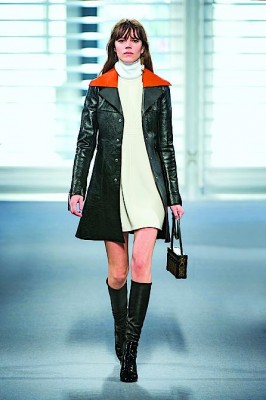 Для прохладных осенних вечеров в коллекции Louis Vuitton можно найти жесткое, словно футляр, пальто из матовой телячьей кожи. Наподобие тех, что носили в свое время модницы Франсуаза Арди и Жаклин Кеннеди. Оно отлично сочетается с глянцевым блеском ботильонов со скругленным каблуком и завышенной щиколоткой, которые украшают ремешки из мягкой кожи — точно такую же используют при создании сумок Louis Vuitton.