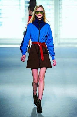 Так, в своей первой коллекции для Louis Vuitton Жескьер вдохновлялся 1960-70-ми — оттуда родом все эти жесткие жакеты и трапецевидные юбки. Но если узкие брюки с завышенной талией и обтягивающие фигуру комбинезоны вполне традиционны для той эпохи с точки зрения фасона, то материалы, которые используются для их созданию, используются современные.