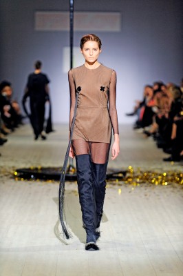 Молодой дизайнер Иван Фролов, получивший на последней церемонии Best Fashion Awards награду «Открытие года», сполна оправдал это звание, показав одну из наиболее ярких коллекций. Тему стриптиза Ивану удалось обыграть таким образом, что при всей провокационности в коллекции не чувствуется вульгарности. Обилие блеска и прозрачных тканей, оригинальные принты в виде неоновых вывесок кабаре, мотив американского флага — интересных деталей в этих образах было достаточно. Но наиболее эффектным стало ироничное прочтение профессиональной экипировки стриптизерш — одежда телесного цвета с аппликациями в виде подвязок от чулок или леопардовых стрингов и украшения в виде пэстис (накладок на соски) с длинной шелковой бахромой. Разве что профессиональная обувь для стрип-пластики на танцовщице у шеста, развлекавшей публику перед показом, выглядела несколько чрезмерно.