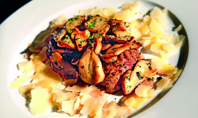 Квинтэссенция «пятого вкуса» — медальоны из телятины с белыми грибами и пармезаном (270 г, 149 грн). Два сочных, упругих, правильно прожаренных и хорошо приперченных медальона расположились в окружении щедрой порции ароматных жареных боровиков и крупных хлопьев пармезана. Мне почему‑то кажется, что это мужской обед или ужин мечты под вино.