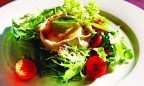 Салат с теплым запеченным сыром бюш, зеленью, томатами черри и анчоусовым соусом (180 г, 119 грн) тоже яркий и сытный. Маринованные филе анчоусов заменяют соль. Сыр придает блюду плотность и основательность, а томаты и руккола освежают вкус.