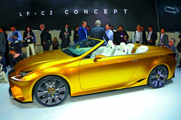 Еще больше вопросов вызвал Lexus LF-C2. Нужно было видеть озадаченные лица посетителей, шарящих глазами по корме двухдверки в поисках хоть каких‑то подсказок — куда и как складывается верх. Самые смелые, так и не обнаружив линии разъема на крышке багажника, предположили, что она поднимается целиком и против движения. Непонятно было и какова она, эта крыша. Классический тент как у BMW? Металлическая трансформируемая «кепка» а-ля Mercedes? Японцы словно изучают спрос, ведь конкуренты продолжают использовать прорезиненные материалы, в то время как открытые Lexus были исключительно купе-кабриолетами со всеми вытекающими минусами — неидеальный силуэт, громоздкая, тяжелая и дорогая система складывания крыши и чисто символический багажник.