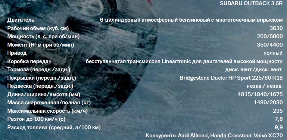 Еще более приятное послевкусие оставляют тактильные ощущения от прикосновений к почти горизонтальным «поребрикам» под торпедо, инкрустированным шпоном, к мягким вставкам на передней панели и к подлокотникам более удобной, чем раньше, формы. Не забыт и багажник — это же универсал! Если сложить кресла заднего ряда, то полезный объем увеличится с и без того впечатляющих 1005 литров до рекордных 2076 литров. Увы, ровной погрузочной платформы, как раньше, уже не получится. Из приятных мелочей стоит отметить электропривод пятой двери, который можно запрограммировать на определенную высоту, что удобно при перевозке длинномеров, и особенно — в гаражах с низким потолком. Более того, сама ручка двери снабжена прочным крюком, выдерживающим до 3 кг груза. Вспомните, как иной раз не хватает такого помощника, чтобы повесить сумку или вешалку с одеждой, загрузить более габаритную поклажу или домашних животных. Усовершенствованию подверглась и система рейлингов, которые теперь, помимо имиджевой нагрузки, могут выполнять и прямые хозобязанности. Благодаря поворачивающимся на 90 градусов планкам стало удобнее перевозить на крыше неформатные предметы вроде лыж или лодки. Так что, как ни крути, Outback — идеальный сообщник для побега не только из пустыни, но и из леса. С предновогодней елкой.