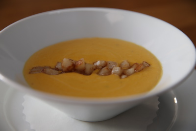 Начнем описание новинок сезона осень-зима 2013 года с супов. Их два, и обоим можно прогнозировать массовую любовь и признание: крем-суп из лесных грибов с пармезаном (250 г, 69 грн) и крем-суп из тыквы с тартаром из гребешка (300 г, 65 грн).