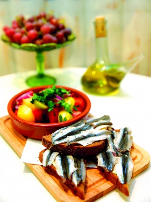 Наверное самое популярное блюдо в кафе «Arbequina», которое заказывают и хрупкие девушки к бокалу домашнего испанского вина, и серьезные мужчины «под пиво», — тюлька на ржаных тостах с помидорным салатом (380 г, 58 грн). Секрет не только в одном из лучших в мире вкусовых сочетаний тюлька-лук-помидор-черный хлеб, но и в засоле фирменной одесской хамсы.